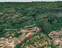 ![]() Oblique Landsat image of Holleford crater draped over digital elevation model (x10 vertical exaggeration). Although the crater itself is buried, its location (arrows) is marked by a subtle surface depression. Screen capture from NASA World Wind. | |