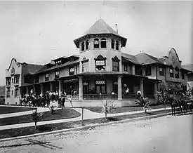 The Hollywood Hotel opened in December 1902. It was built by early Hollywood developer H.J. Whitley, to support selling residential lots to potential buyers arriving from Los Angeles by the electric Balloon Route trolley of the Los Angeles Pacific Railroad.[1][2] It was developed on property owned by Harrison Gray Otis, George Hoover, and Whitley.[2] Located on the west side of Highland Avenue, the elegant wood structure with Mission Revival style stucco facades and broad verandas also fronted on unpaved Prospect Avenue, lined with California pepper trees. The hotel was sited among lemon groves then at the base of the Hollywood Hills, part of the Santa Monica Mountains in the area. Whitley was instrumental in improvements to Prospect Avenue, which in 1910 was renamed Hollywood Boulevard. Increasing business compelled the building of an additional 40-room wing onto the hotel in 1905.[2]