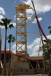 Construction began in May 2008 with preliminary land clearing, which caused the removal of some of Twister...Ride it Out's outdoor extended queue.[10] The first track pieces were installed during the week of December 7, 2008.[11] In February 2009, Universal launched a website for the attraction, which included a construction blog and photographs chronicling progress of the attraction's construction.[12][13] The track layout was completed at the end of April 2009 with the crowning of the lift hill.[14][15]
