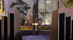 Holocaust Memorial is a sculpture that conveys a circular space, which is 10 ft x 24 ft x 20 ft.[1] The ground is laid brick that is almost enclosed by granite seating which forms the circle. At the entrance there are 22 trapezoid panels of steel, eleven on each side. Each trapezoid has a name in steel that can be seen from inside the circle. On the opposite side of the entrance there is a Granite Pillar with a yellow band. The sculpture also has an inscription which reads "IN MEMORY OF THE SIX MILLION JEWISH MARTYRS WHO PERISHED IN THE HOLOCAUST AND IN RECOGNITION OF THE COURAGE AND SPIRIT OF THE SURVIVORS"