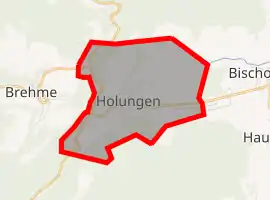 Holungen is located at the foot of the Ohm Hills at the bottom of the Bode valley, about 35 km from the Harz mountains. It is a so-called Haufendorf ("clustered village"; denotes an irregular, unplanned and quite closely packed village, built around a central square). To the south lie the Sonder and the Ohmberg with the “Wilde Kirche” (Wild Church). The Hohenkammer lies to the west, where the Segeltal valley separates it from the Sonder. To the north, the 486-metre-high Sonnenstein rises above the village. In addition, the Graseforst is found there. The course of the Bode runs along the valley floor to the east. There is also a large spoil heap from potash mining, which is nearly as big as the adjacent mountains.