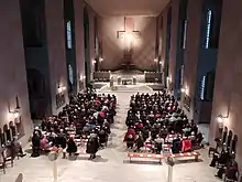 At 1. August 2007 the Roman Catholic Diocese of Limburg intended the church on instruction of former bishop Franz Kamphaus to the Holy Cross - Centre for Christian Meditation and Spirituality. The centre is a pastoral institution of the diocese[2] and is subordinated to the head of department of episcopalian chair (Prof. Dr. Hildegard Wustmans).[11] In the center church services, meditation courses, contemplative prayer, Zen-meditation courses, days of reflection, spiritual exercises, retreats, and other meetings are offered. The Padre Helmut Schlegel of the Franciscan[3] takes the responsibility for the offers as director/conductor of the center until July 2018 and as a priestly employee until June 2019. In November 2018 the theologian Samuel Stricker took over the leadership of the meditation center and in August 2019 Olaf Lindenberg the role as a priestly employee.[4] The team includes colleagues like for example from the Medical Mission Sisters (MMS).[5] Although the offerings of the centre are affected by Christianity the target audience includes humans of all Religious denominations, world views and cultures. The team[4] publishes regularly a program semiannual.[12] It was the first institution of its kind in Germany. The Holy Cross Church is one of five profile churches of the Diocese of Limburg. Furthermore, there are besides the Centre for Mourning Counselling (German:Zentrum für Trauerseelsorge) in St.Michael in Frankfurt-Nordend as well founded in 2007 also the three youth churches (German: Jugendkirchen) Crossover in St. Hildegard in Limburg an der Lahn, Jona in St. Bonifatius in Frankfurt-Sachsenhausen and Kana in Maria-Hilf in Wiesbaden-Nordost which were founded already in 2005.