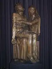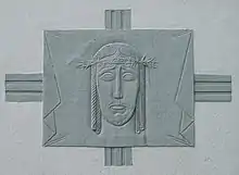 Next to the crypt is a large auditorium with a stage, the parish hall of the former Holy Cross parish. In the foot of the tower building, which consists of seven floors, there is also the tower hall (German: Turmsaal), which is still used by the new parish of St. Josef Frankfurt am Main. On the outer walls of the side aisles, the inside of the left front partition of the left side aisle to the church room and the rear wall of the entrance hall in the tower building is a painted Stations of the Cross of the artist Georg Poppe. The penultimate (13th) station of the Stations of the Cross was until 2020 the Pietà made of wood by the sculptor Arnold Hensler[22] and Otto Zirnbauer.[23]
