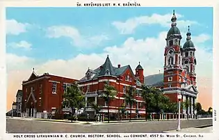 Holy Cross Church (Chicago), referred to in Lithuanian as Šv. Kryžiaus Bažnyčia, is a historic church of the Roman Catholic Archdiocese of Chicago located on West 46th Street in Chicago, Illinois. Built by Lithuanian immigrants, it bears a striking resemblance to many of Chicago's so-called "Polish Cathedrals" by virtue of the common heritage Poles and Lithuanians shared during the Polish–Lithuanian Commonwealth and reflected in their architectural tastes. Holy Cross merged with the nearby Immaculate Heart of Mary Church on 45th and Ashland to make one parish, Holy Cross - Immaculate Heart of Mary.[1] In 2021, the parish was further united with two nearby churches.[2]