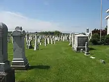 Located on the southwestern corner of Frenchtown's primary intersection,[2] that of Burns Road and State Route 185,[6] the church is partially surrounded by other properties associated with the parish. Members of Holy Family Church first built a rectory for their pastor in 1850. It was replaced by a larger brick structure in the 1880s;[5] it lies on the northern side of Burns Road, directly across from the church. A more recent parish hall is located on the southern side of the road to the west of the church. A church cemetery, small but heavily used, lies immediately to the south and east of the church.[2] Founded before the establishment of the parish, the cemetery includes burials as old as 1842;[5] it is officially known as the "Frenchtown Cemetery," although it has also been known as the "Holy Family Cemetery."[7]