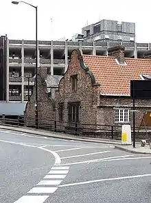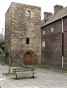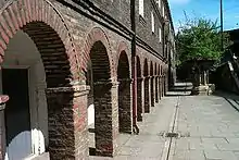 The Holy Jesus Hospital was built in 1681 by public subscription to house retired Freemen, their widows or unmarried sons or daughters.[8][12][13] The hospital was commonly known by local people as the "Freeman's Hospital" and the "Town's Hospital" but on 26 March 1684 the building was incorporated by the name of the master, brethren, and sisters of the Hospital of the holy Jesus.[8] The Mayor, alderman and Common Council of Newcastle were appointed as visitors and charged with setting the rules for the hospital.[14] Shortly afterwards the founders bought a quay and garden, in the Close for £700 and an estate in Edderly, County Durham for £1610, and another estate at Whittle, Northumberland for £1300 and the master and brethren of the hospital were settled across these properties.[8] The building itself was constructed using brick construction which was then a relatively new method (brick was usually used as an infill for timber-framed buildings).[15] Indeed, the structure is one of only two 17th-century brick buildings in Newcastle upon Tyne, the other being nearby Alderman Fenwick's House in Pilgrim Street.[13] To be allocated a room, one had to meet the committee's criteria[16] and once were admitted one had to abide by the master's rules. It remained in use until 1937, when the new hospital was built at Spital Towers. Strict rules governed the "inmates" including being locked in their rooms at 9 pm and having their doors unlocked again at 6 am. There were no children allowed, and the inmates were instructed to attend church each week and take the sacrament. Each year the residents would have been given a free suit of clothing, a measure of coal and, if the charity allowed it, some pocket money (Alms).
