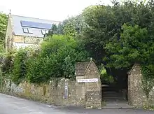 Holy Trinity was built using local stone and flint, with Ham stone dressings, quoins and buttresses, in an Early English style.[2] Able to accommodate 400 persons,[8] it was made up of a nave, a chancel with small vestry, two side aisles, and a north and south porch.[3] The circular pulpit was built of English oak on a base of Ham stone, while the octagonal font and its base was also carved from Ham stone. The reredos were carved in Caen stone, with marble pillars and a Ham stone ledge, and the pews of pitch pine.[2] Since becoming redundant, the church's bellcote has been removed but originally contained a single bell.[9]