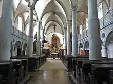 The Church of the Holy Trinity in Opočno was built in its present form with three naves and groin vaults supported by 10 pillars in 1567. In that time the owner of Opočno Vilém Trčka of Lípa decided to rebuild his residence in Opočno Castle as well as the adjoining Chapel of St. Andrew. The Gothic chapel was extended and converted into a Renaissance church. Although the new church was built in the heyday of the Renaissance style in Bohemia, the ceiling of the church still resembles the older Gothic architecture. On the other hand, the stone galleries with embossed decorations inside the church provide evidence for a strong influence of Italian Renaissance architecture. A passageway leading to the family oratory in the first floor of the church connects the church with Opočno Castle.