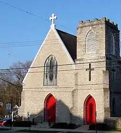 The Church of the Holy Trinity was organized in 1847. The church building was constructed during the years 1864-1868 by John and Henry Clarke. The stone for the church was quarried from the actual site. The church was consecrated on June 23, 1870. A parish hall was added to the property in 1966. The free-standing building is compatible with the Gothic architecture of the church building. Adjacent to the church is a memorial garden with a columbarium for the interment of those choosing cremation.[2]