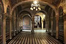 The exterior features two-tone brickwork and gilded archways.[2] The elaborately ornamented sanctuary shows a stylish allusion to Baroque church architecture typical of southern Germany and Austria. A number of frescoes for the facade and vestibule were commissioned from the Austrian painter and art professor Carl Rahl, with other frescoes by Ludwig Thiersch.
