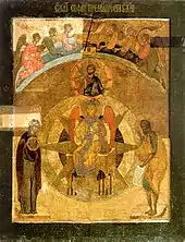 A related but highly divergent type is known as "Wisdom hath builded her Home" (Премудрость созда Себе дом). The name is a quotation of Proverbs 9:1 and references the incarnation of Christ the Logos, identified with Holy Wisdom, the "house" being the Theotokos. The earliest icon known under this title is a late-14th-century fresco in the Church of the Assumption in Volotovo Field, Veliky Novgorod, but its most notable representation is the mid-16th-century icon from the Cathedral of Athanasius and Cyril of the Alexandrian Kirillov Monastery near Novgorod.[3] The composition of these icons develops during the 17th and 18th century in a reflection of the developing views in Russian mysticism, culminating in the "Sophiology" dispute in the early 20th century. The main point of contention is the question whether "Wisdom", i.e. Christ, or the "House", i.e. the Theotokos, should take center stage.[4] In the original conception of this type, the Volotovo Field icon and derived examples of the 16th century, "Wisdom" is depicted as in the Novgorod type, as a fiery winged angel sitting on a throne, while the Theotokos with Child is shown separately. By the 18th century, there are two competing variants, one centered on crucified Christ and the other the Theotokos.