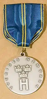 The Home Guard Silver Medal (Swedish: Hemvärnets silvermedalj, HvSM[1]) is a Swedish reward medal established in 1951 by the National Home Guard Council (Rikshemvärnsrådet). It is awarded for significant service contributed to the development of the Home Guard.[2]