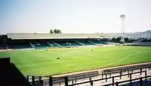 A new double-decker Grandstand was built in 1952, one of the last to be based on the template made popular during the 1920s and 30s by prolific football stadium architect Archibald Leitch, with floodlights installed in October 1953.[14] Running the length of the pitch, it had standing room in the first tier, known as the Mayflower Terrace, and wooden seating in the second tier.[19] When a roof was erected on the Lyndhurst side of the ground in 1964, three-quarters of the ground were under cover, with all but the second tier of the Grandstand being standing room. In the 1969–70 season seats were added at the back of the Mayflower Terrace, which took the seating capacity to 4,100 and the overall capacity to 40,000.[14] In the late 1970s the pitched roof at the Devonport End of the ground had to be removed for safety reasons.[3] It was replaced in 1984 by a non-pitched structure, leaving just the Barn Park End uncovered.[20]