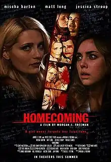Homecoming is a 2009 American independent horror-thriller film,[1] directed by Morgan J. Freeman and written by Katie L. Fetting, Jake Goldberger and Frank Hannah.[2] The film follows a student couple, Mike (Matt Long) and Elizabeth (Jessica Stroup), on their homecoming. Elizabeth is taken home by Mike's ex-girlfriend Shelby (Mischa Barton) after a road accident. Shelby is soon revealed to be fixated on Mike and subsequently treats Elizabeth in a cruel and deranged manner.