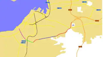 ![]() Homeros Blvd (green & red) together with the Buca-Bornova (blue) and Konak (purple) tunnels. Other main roads are in yellow, motorways are in orange. (Click to enlarge) | |||