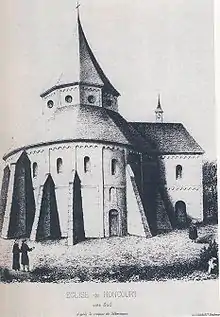 Construction of the abbey church began in 1186 and was finished a century later under abbot Conrad III in 1286. The church was an exceptional structure, circular, like the rotunda of Senones Abbey, adjoining a rectangular choir. The church too was demolished by the order of the abbess of Andlau in 1782. In its circular form, a great rarity, the abbey church strongly resembled the church of Ottmarsheim near Kembs, an outstanding example of primitive Romanesque architecture and a faithful replica, only smaller, of the Palatine Chapel in Aachen.