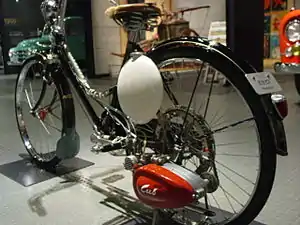 ![]() The Honda Cub F engine, introduced in 1952, mounted on a bicycle at the Toyota Automobile Museum in October, 2005. | |