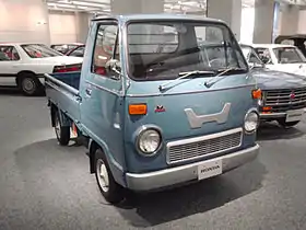 The TN-V, presented in June 1972, was the next facelift. The TN-V received new sheetmetal in front, with a big toothy grille and twin, vertically stacked headlights.[2] The oversized "H" on the front was replaced by "Honda" lettering. It was a commercial companion to the Honda Life kei truck. It had a lower compression engine, necessary to meet tighter emissions standards, and only had 27 PS (20 kW) at a considerably less peaky 7,000 rpm. The modified engine was now also able to run on unleaded petrol, thanks to alloy valve guides and seats.[7] Torque figures stayed unchanged and the weight of the base model also remained at 540 kg (1,190 lb).[1] The TN-V also had a standard drivers' seatbelt while the turn signals were now made separate from the rear lights.