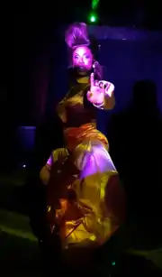 Prior to appearing on Drag Race, Davenport was a frequent competitor in drag pageants, where she amassed a total of 18 titles by 2018.[51][52] The first pageant she ever competed in was Miss Stonewall, which she attempted four times before winning in 2015.[53][54] Fourteen of her victories fell in the three-year period between 2013 and 2016.[34] Notable among these was the national crown of Miss'd America 2015.[3][35][55] Concurrent with that reign, she held seven other titles.[54][56] In February 2018, Davenport won the Miss Paradise pageant in Asbury Park, New Jersey.[57] She had been performing at Paradise, the nightclub that hosts that pageant, since Sahara Davenport first brought her there years earlier.[9]