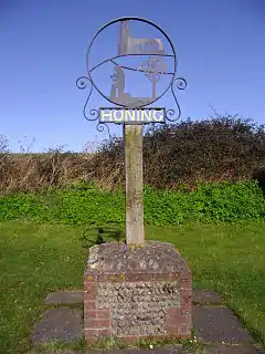Honing is a large parish in north-east of the county of Norfolk. Its northern boundary is with the civil parish of Witton whilst to the south is the parish of Dilham. West lies Worstead and on the eastern boundary is the parish of East Ruston. The disused North Walsham & Dilham Canal runs along the south-west boundary of the parish. There are several areas of common land within the parish, including Crostwight Common and Honing Common. The Weavers' Way long distance footpath runs across the south east corner of the parish along the old track bed of the Midland and Great Northern Joint Railway that ran between North Walsham and Stalham. The Weavers Way runs for 56 miles (90 km) between Cromer and Great Yarmouth. The village sign depicts a labourer honing his scythe. Since 1935, the civil parish of Honing has incorporated its very small neighbouring village of Crostwight. The name Honing derives from the Old English for something approaching settlement of the people at the hill or rock.[4]