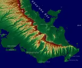 The Honolulu Volcanics are a series of volcanoes in the southeastern sector of Oʻahu[2] and includes dikes, lava flows, spatter cones,[3] tephra deposits,[4] tuff cones,[3] and mesas where the surrounding terrain has been eroded away.[5] Vents span the area southeast of a line between Mokapu Peninsula and Pearl Harbor, and extend from the ridges of Koʻolau volcano to below sea level and to the coast plain of southern Oʻahu.[6]