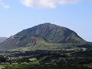 The Honolulu Volcanics are a series of volcanoes in the southeastern sector of Oʻahu[2] and includes dikes, lava flows, spatter cones,[3] tephra deposits,[4] tuff cones,[3] and mesas where the surrounding terrain has been eroded away.[5] Vents span the area southeast of a line between Mokapu Peninsula and Pearl Harbor, and extend from the ridges of Koʻolau volcano to below sea level and to the coast plain of southern Oʻahu.[6]