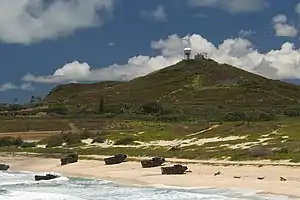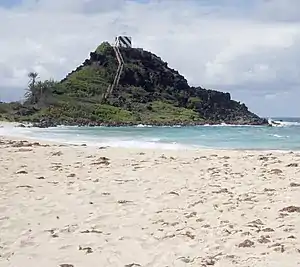 The Mokapu peninsula was formed by Honolulu Volcanics and includes the three volcanic vents of Puʻu Hawaiʻiloa, Pyramid Rock and Ulapaʻu Head; additional vents form islets off the peninsula,[54] such as Moku Manu[55] and Mōkōlea Rock. Puʻu Hawaiʻiloa is a cinder cone in the middle of the peninsula,[56] Pyramid Rock at the northwestern tip[57] is deeply eroded and probably the oldest vent in the peninsula, and Ulapaʻu Head is a crater that was breached by the sea[56] and of which only a crescent-like western part remains.[58]