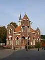 The Dutch Reformed church is modest square church with ridge turret which was built between 1783 and 1785. It was damaged during World War II, and restored between 1947 and 1949.[5] The Catholic St Eligius Church was built in 1861 as a replacement of a 1795 church. It was damaged by war both in 1940 and 1944. The church was restored in 1989, but decommissioned in 2012. In 2019, it was converted to an apartment building.[4][5] The former town hall was built in 1913 with Jugendstil influences and has a little build-in tower.[5]