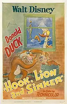 Hook, Lion and Sinker is a Disney short cartoon featuring Donald Duck, who appears as a fisherman, and Louie the Mountain Lion.[1] This is the second episode to feature Louie and the only episode where he is shown to have a son. The film's plot centers on the lions trying to steal Donald's catch of fish. The title is a pun on the phrase "hook, line and sinker".