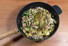 Found in German and Austrian cuisine, the casserole dish is also associated with the cuisine of Minnesota in the Midwestern United States.[2] The basic recipe for the casserole is home fries, ham or salami, onion and eggs. Sometimes it is topped with melted cheese.[3] Other ingredients like green pepper or mushrooms can be added to the basic combination, and a variety of meats can be used including bacon, ham and salami.