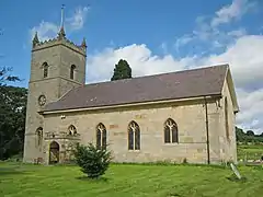 The village church, St Michael and All Angels, was built in 1825: a Norman church had previously stood on the site, but had become dilapidated. The works were funded by Thomas Botfield, who had purchased the manor in 1812.[4] The church contains two war memorials: a marble plaque to men of the parish of Hopton Wafers with Doddington who died serving in the World Wars and another plaque to Lance Corporal Samuel Edwards, KSLI, who was killed in World War I in 1915.[5] The churchyard contains war graves of another KSLI soldier who died in the latter war and of a Royal Army Service Corps soldier of World War II who are among those listed on the parish memorial.[6][5]