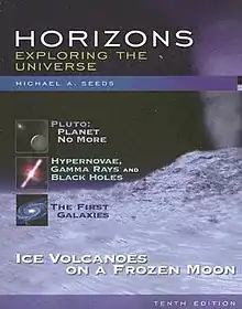 Horizons: Exploring the Universe is an astronomy textbook that was written by Michael A. Seeds and Dana E. Backman. It is in its 14th edition (as of 2019), and is used in some colleges as a guide book for introductory astronomy classes. It covers all major ideas in astronomy, from the apparent magnitude scale, to the Cosmic Microwave Background Radiation, to gamma ray bursts.