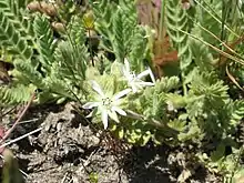 Horkelia marinensis is a rare species of flowering plant in the rose family known by the common name Point Reyes horkelia. It is endemic to the California coastline, where it is known from about Fort Bragg to near Santa Cruz. It grows on beaches and in other sandy coastal areas. This is a perennial herb growing in low, dense patches. The leaves are up to 10 centimeters long and are made up of toothed, hairy, gray-green leaflets each around a centimeter long. The foliage is glandular and strongly scented. The plant produces green to reddish-green stems up to 30 centimeters long which bear inflorescences of dense clustered flowers. Each flower has minute bractlets under reddish-green, fuzzy sepals. The petals are generally white and narrow with rounded ends. The center of the flower contains a ring of stamens around a patch of 20 to 30 pistils.