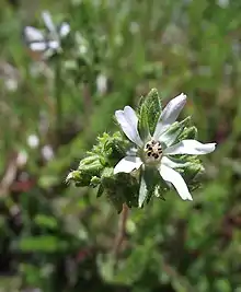 Horkelia tenuiloba is a species of flowering plant in the rose family known by the common names Santa Rosa horkelia and thin-lobed horkelia. It is endemic to California, where it is known only from the coastal hills and mountains north of the San Francisco Bay Area. It is a plant of chaparral habitat.[1] This is a perennial herb producing a low mat of hairy, glandular green foliage around a woody base. The leaves are cylindrical or somewhat flat, often tapering to a point, and each is made up of several densely packed pairs of hairy leaflets. The inflorescence is an array of flowers atop an erect stalk, each flower made up of five pointed green sepals and five white petals. At the center of the flower is a cone of stamens tipped with reddish anthers around many pistils. It flowers in May [2] It is threatened by trampling, trail maintenance, and development.[1]