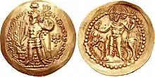 Coins of Hormizd I Kushanshah were minted at Kabul, Balkh, Herat, and Marw.[5] The synchronicity of the Kushano-Sasanians with the rulers of the Kushan Empire is rather well established, as a large quantity of the early copper coins of Hormizd I Kushanshah from the south of the Hindu-Kush were overstruck by the Kushan Emperor Vasudeva II (r. 275–300).[13] Some of Hormizd I Kushanshah's coins imitate Kushan coinage, with king standing in Kushan military dress on the obverse, and the deity Oesho on the reverse.[5] Other coins however follow more closely the Sasanian pattern, with him being portrayed in the Sasanian style, and with fire altar or deity on the reverse.[5]