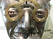 The helmet includes a face piece with protruding eyes, a toothy grimace and a stubbly chin.[2] The face includes fine detail such as crow's feet around the eyes and a drip beneath the nose.[3] Ram's horns, made from sheet iron, are rivetted to the upper part of the helmet.[3][2] The helmet has hinged cheekpieces, with rosette decoration around the ear holes.[2] The face of the helmet has a pair of copper-alloy spectacles.[3] It is not known if these were original to the helmet, but they date from before 1547.[7] The spectacles are of the hinged type, known in Europe since the mid-14th century. The spectacles may have originally been gilded and are non-functional, not being fitted for lenses.[3]