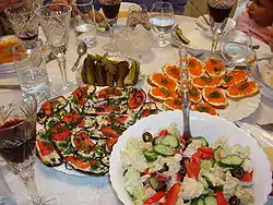 A small number of food historians believe that the tradition may have begun in Russia, where small snacks of fish, caviar and meats were common after long travels.[8] However, it may be that the custom originated in China, possibly coming through Steppes, into Russia, Scandinavia, France and other European countries. The tradition may have reached Italy, Greece and the Balkan nations through Russia or Persia. Many national customs are related, including the Swedish smörgåsbord, Russian zakuska, middle eastern mezze, and Italian antipasto.[9] During the Roman Period the meal practice was to have two main courses which were supplemented before the meal with small amounts of fish, vegetables, cheeses, olives[10][11] and even stuffed dormice.[12] These would be served at the start of the meal known as either gustatio or promulsis. The Greeks called the appetiser course propoma.[11] As early as 500 CE, the Babylonian Talmud (Yoma 83b) recounts the practice of feeding sweet desserts to a person before the main course of a meal in order to revive his strength and increase his appetite (Aramaic: מגרר גריר).