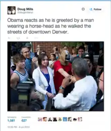 In July 2014, President Barack Obama was photographed in the streets of Denver shaking the hand of a horse headed bystander resulting in national press exposure of the mask including a series of articles in The Washington Post about the meme's history and cultural influences.[2][10][3][11]