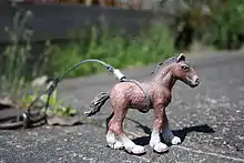 In September 2005, Woodstock resident Scott Wayne Indiana tied his first plastic toy horse to a horse ring located in the Pearl District.[1][11][12] Of his attempt to draw attention to the rings, and to celebrate Portland's history, Indiana said: "I loved the rings, and felt that people just weren't noticing them. This was an attempt to shake people out of their routines and get them to notice their surroundings."[1] Since then, the Horse Project has gained momentum and participation;[2] horses can be found tied to rings throughout the city, especially in east Portland. The installations have sparked interaction with residents, who have left hay, lassoes, riders, saddles, water, wool blankets, and other "treats" for the horses.[1][13][14] Horses are often defaced or go missing.[1][15][16]
