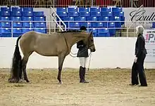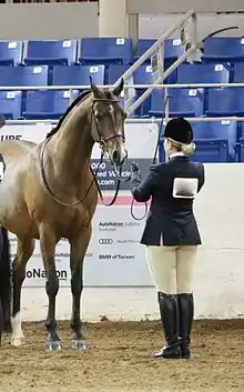 Showmanship is an event found at many horse shows. The class is also sometimes called "Fitting and Showmanship", "Showmanship In-Hand", "Showmanship at Halter" or "Halter Showmanship" It involves a person on the ground leading a horse, wearing a halter or bridle, through a series of maneuvers called a pattern. The horse itself is not judged on its conformation. Exhibitors are judged on exhibiting the animal to its best advantage, with additional scoring for the grooming and presentation of both horse and handler.