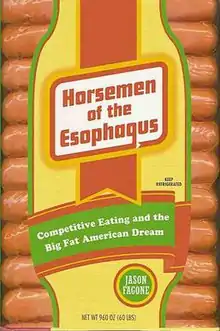 Horsemen of the Esophagus by Jason Fagone is a nonfiction book about the sport of competitive eating and the outsized American appetite. Horsemen follows three American "gurgitators" during a year on the pro eating circuit: Ohio housepainter David "Coondog" O'Karma, South Jersey truck driver Bill "El Wingador" Simmons, and Manhattan day-trader Tim "Eater X" Janus. Horseman makes stops at 27 competitive eating contests around the world, including the Nathan's Famous Hot Dog Eating Contest at Coney Island and includes an interview with Nathan's champion at the time, Takeru Kobayashi.