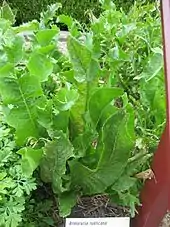 Horseradish grows up to 1.5 meters (5 feet) tall, with hairless bright green unlobed leaves up to 1 m (3 ft 3 in) long that may be mistaken for docks (Rumex).[2]: 423 It is cultivated primarily for its large, white, tapered root.[3][4][5][6] The white four-petalled flowers are scented and are borne in dense panicles.[2] Established plants may form extensive patches[2] and may become invasive unless carefully managed.[7]