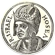 Hoshea (Hebrew: הוֹשֵׁעַ, Hōšē‘a, "salvation"; Akkadian: 𒀀𒌑𒋛𒀪 Aúsiʾa [a-ú-si-ʾ]; Latin: Osee) was the nineteenth and last king of the Israelite Kingdom of Israel and son of Elah (not the Israelite king Elah). William F. Albright dated his reign to 732–721 BCE, while E. R. Thiele offered the dates 732–723 BCE.[1]