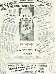 NUCO Guild of Nurses was led by nurses such as Iris Brook (Guild of Nursing organiser from 1937), Doris Westmacott, and Deptford Councillor Beatrice Drapper. It organised a Masked Nurses protest on 26 November 1937, where nurses in white uniform with white masks marched through London and were prevented by the police from entering the City of London. 500 attended a meeting at St Pancras Town Hall addressed by George Lansbury demanding a 96-hour fortnight.[2]