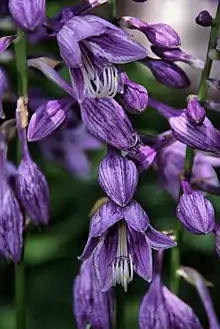 The flowers of hosta are produced on upright scapes that are woody and remain on the plant throughout winter, they are generally taller than the leaf mound, and end in terminal racemes.[11] The individual flowers are usually pendulous, 0.75–2 in (2–5 cm) long, with six tepals,[12] white, lavender, or violet in color and usually scentless. The only strongly fragrant species is Hosta plantaginea, which has white flowers up to four in (10 cm) long; it is also unusual in that the flowers open in the evening and close by morning. This species blooms in late summer and is sometimes known as "August Lily".