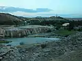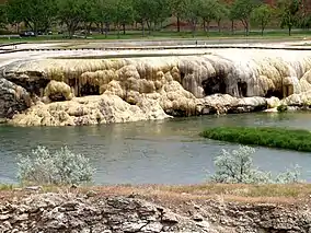 The park features a managed herd of bison, a suspension foot bridge across the Big Horn River, picnic shelters, boat docks, flower gardens, and terraces made of naturally forming travertine (calcium carbonate) caused by a flowing mineral hot spring.[4] The park area encompasses commercial hotels and several state-run and privately operated entities including the Gottsche Rehabilitation Center, Hot Springs County Memorial Hospital, the historic Callaghan Apartments/Plaza Hotel, the Star Plunge waterpark, the Tepee Pools waterpark, and the Wyoming Pioneer Home, a state-run, assisted-living facility.