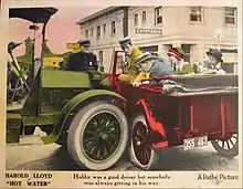 The film is a light comedy with minimal character development, and followed Lloyd’s early 1920s pattern of alternating what he called “gag pictures” with “character pictures”. Some distributors had complained about the length of his previous elaborate feature Girl Shy, and Hot Water was the response. Its storyline was also interesting as a unique departure from most of Lloyd’s 1920s features, because his character was married with a family, and was not striving for success, recognition, or romance. It was popular at the box office and grossed $1,350,000, an excellent return for a film of the period. The fictional "Butterfly Six" was in reality a 1923 Chevrolet Superior Sedan.