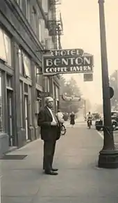 - Important sources differ regarding the form of the hotel's name. Databases from the National Park Service (NPS)[2][3] and Oregon State Historic Preservation Office[4] list the name as "Benton Hotel", but the NPS's official National Register listing announcement[5] uses "Hotel Benton". The National Register nomination documentation for the hotel[1] gives "Hotel Benton" as the historic name and "Benton Hotel" as the common name. This article adopts "Hotel Benton" because the historic name emphasizes the historic significance of the hotel, and because the nomination form and Federal Register announcement are sources of a more foundational nature than the databases.