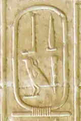 Hotepsekhemwy is commonly identified with the Ramesside cartouche names Bedjau from the Abydos king list, Bedjatau from Giza, Netjer-Bau from the Sakkara king list and the name Bau-hetepju from the royal canon of Turin. Egyptologist Wolfgang Helck points to the similar name Bedjatau, which appears in a short king list found on a writing board from the mastaba tomb G1001 of the high official Mesdjeru. "Bedjatau" means "the foundryman" and is thought to be a misreading of the name "Hotepsekhemwy", since the hieroglyphic signs used to write "Hotep" in its full form are very similar to the signs of a pottery kiln and a chick in hieratic writings. The signs of two Sekhem sceptres were misread as a leg and a drill. A similar phenomenon might have occurred in the case of King Khasekhemwy, where the two sceptres in the Horus name were misread as two leg-symbols or two drill-signs. The Abydos king list imitates this Old Kingdom name form of “Bedjatau”. The names "Netjerbau" and "Bau-hetepju" are problematic, since Egyptologists can't find any name source from Hotepsekhemwy's time that could have been used to form them.[1][14][15]