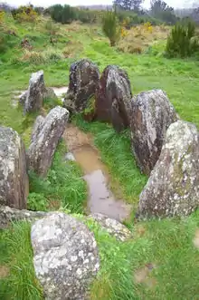 This is one of the rare funerary coffers under a tumulus in a region where tombs of the same period usually have covered passages.[7] It was excavated in 1982–1983.[8] The tumulus that covered the coffer was made up of small stones held in place by slabs, 0.8 metres (2.6 ft) to 1.6 metres (5.2 ft) long, driven diagonally at an angle of 45°[9] about 15 centimetres (6 in) into the ground.[7] The actual coffer is surrounded by 12 red schist slabs delimiting a funerary chamber 2.9 metres (9.5 ft) long by 1.5 to 1.6 metres (4.9 to 5.2 ft) wide[10] and not exceeding 1.4 metres (4.6 ft) high.[11] It must have been covered by other slabs which have since disappeared,[9] having been destroyed by treasure hunters.[3]